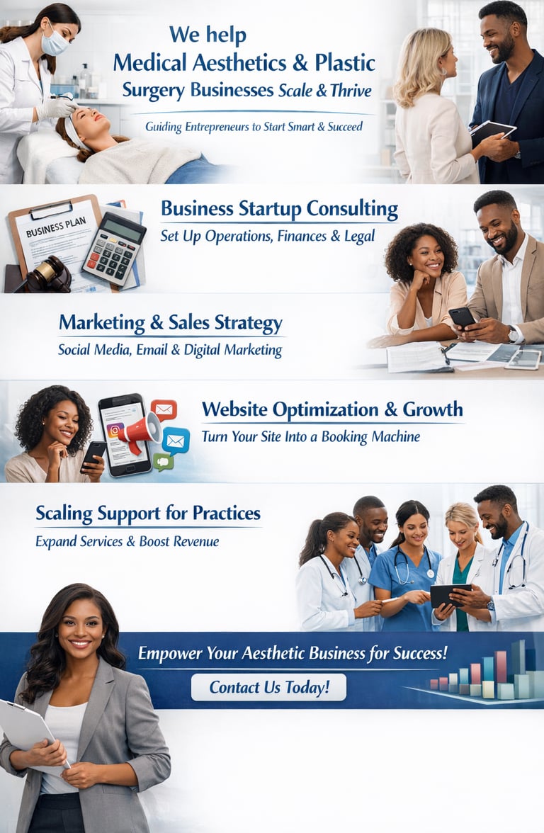 We specialize in helping medical aesthetics and plastic surgery businesses scale and thrive, while also guiding new entrepreneurs to start smart from the beginning.